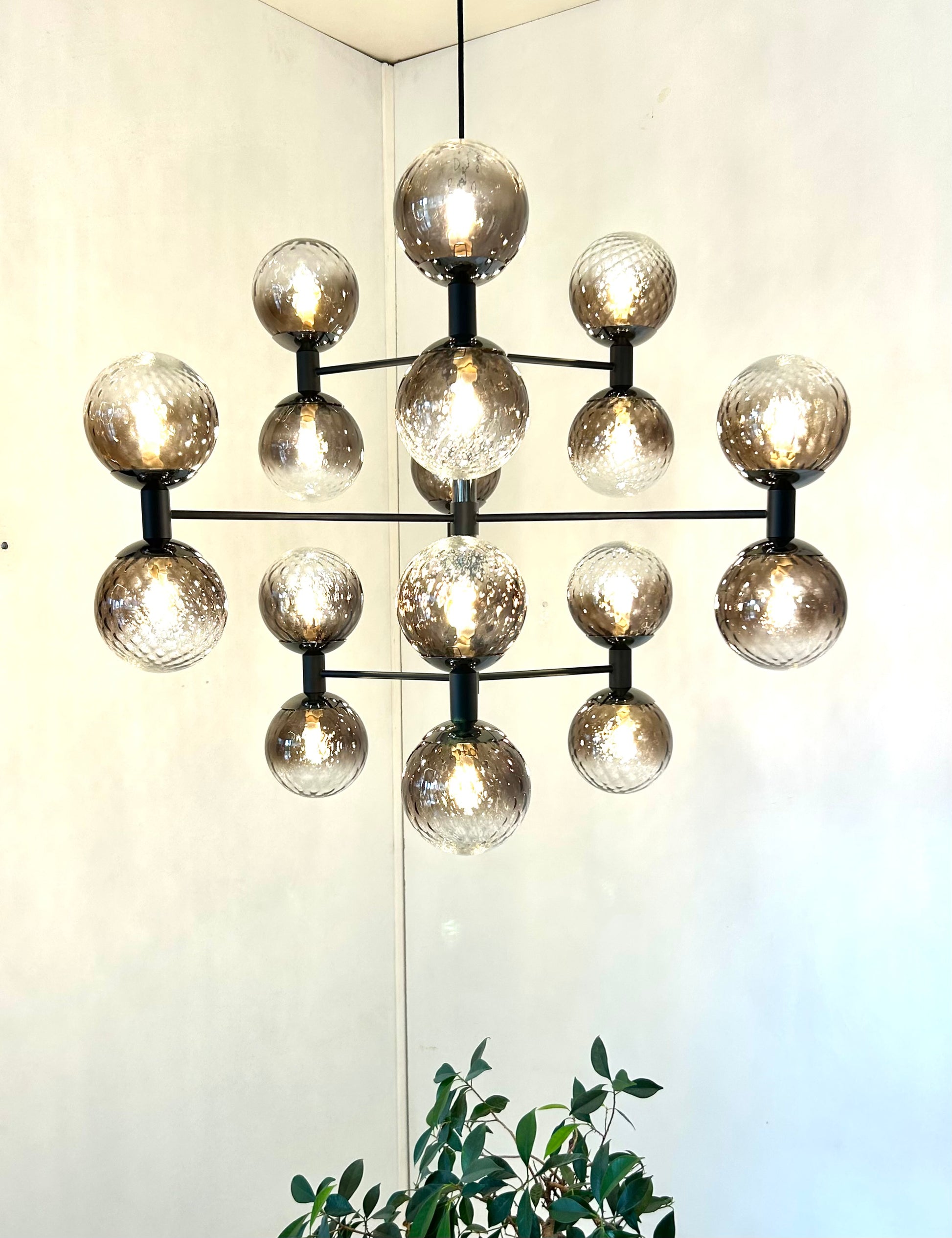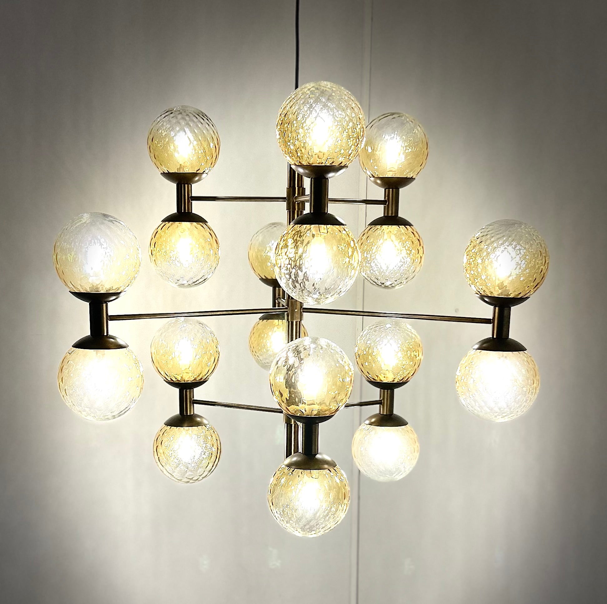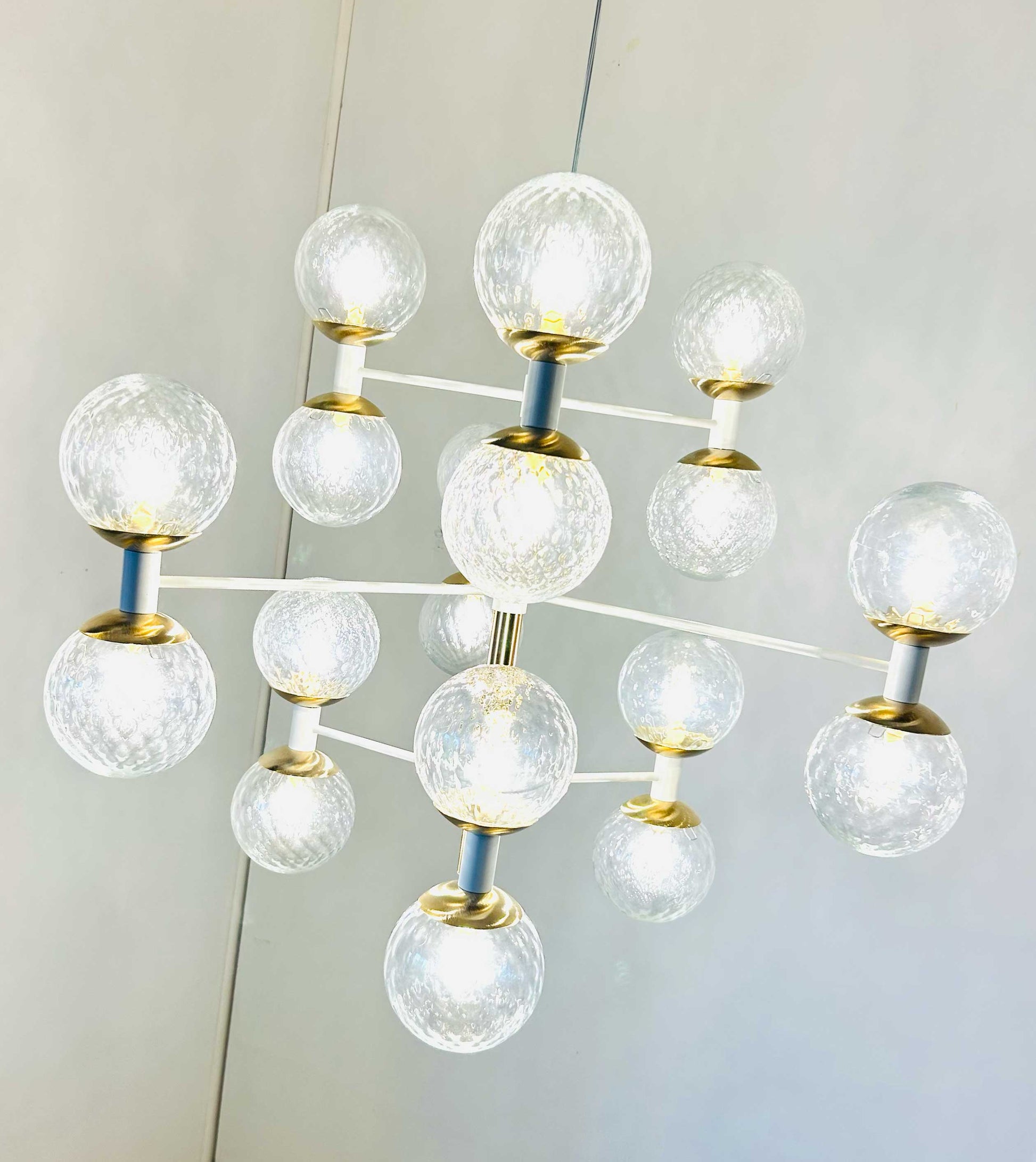 Molecole, l'armonia del design in sospensione. Un intreccio di sfere in vetro trasparente e bianco sfumato che rievoca la forma di una molecola, creando un equilibrio perfetto tra design e luce. La struttura in acciaio sostiene le sfere, diffondendo una luce soffusa e avvolgente che trasforma ogni ambiente in un capolavoro di eleganza.